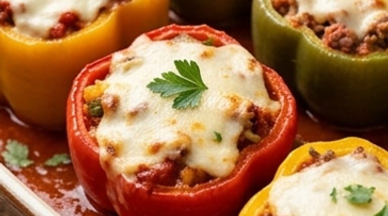 📌 Beef and Rice Stuffed Peppers with Mozzarella Gratin