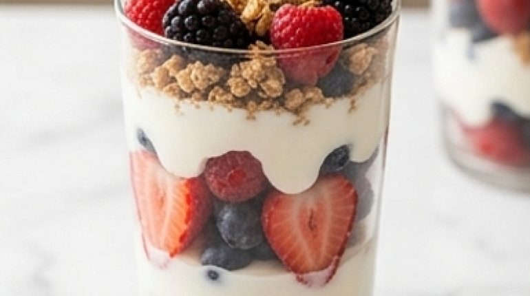 That crunch under the spoon when the granola gives way over the cold yogurt — that’s the sound of a good morning. A berry yogurt parfait is prepared in less time than it takes to wait for the coffee to brew. No heat, no technique, just layers.