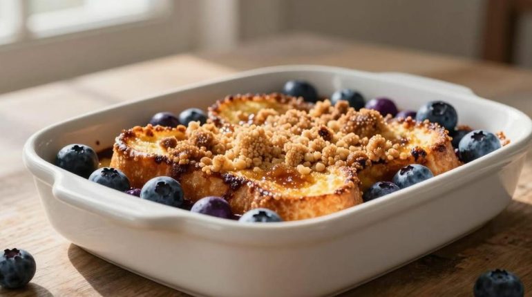 This blueberry French toast bake casserole version requires preparation the night before: slightly stale bread cubes soak overnight in a luscious egg and blueberry cream. In the morning, simply add a crunchy brown sugar streusel before baking. This method completely transforms the texture and guarantees a result that is soft at the heart and crispy on the surface.