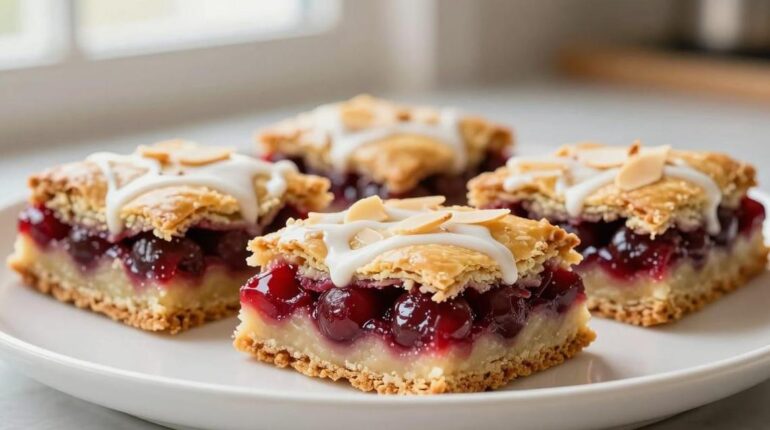 Cherry Pie Bars are a hit every time: gone from the table before the meal is even over. This hybrid recipe between a classic tart and a vanilla cake combines a melting golden crust, a tangy cherry filling, and an almond glaze that perfectly balances the whole. Perfect for holidays, potlucks, or a gourmet weekend, they never disappoint.