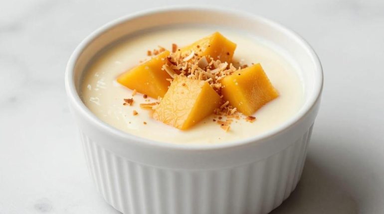 This coconut and mango panna cotta transforms the classic Italian dessert into an irresistible tropical creation. Ready in just 25 minutes of preparation and cooking, this recipe combines silky coconut milk cream with the fruity freshness of mango and the crunch of toasted coconut. A restaurant-worthy dessert, surprisingly simple to make.