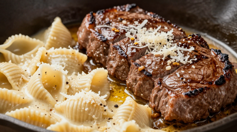 Garlic butter steak and creamy pasta: here is the comfort dish that combines tenderness and intense flavors in less than 30 minutes. Perfectly seared beef bites meet shells coated in smooth parmesan. A simple recipe that transforms an ordinary dinner into an unforgettable gourmet moment.