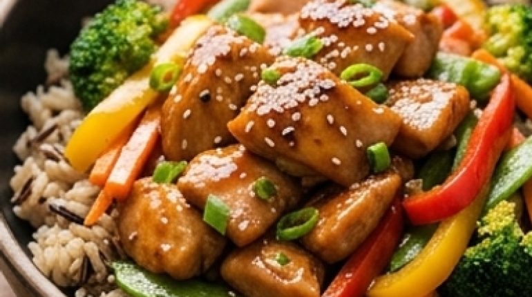 📌 Glazed Teriyaki Chicken Stir-Fry, Crunchy Vegetables and Wild Rice