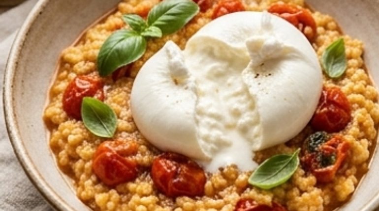 📌 Golden Millet Risotto with Cherry Tomatoes and Melting Burrata