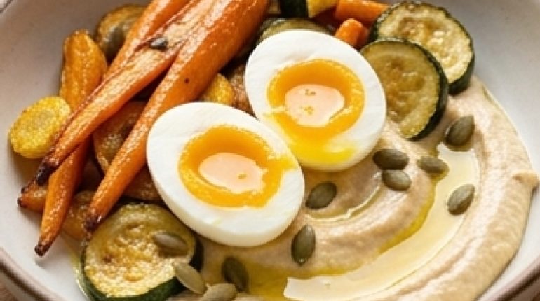 📌 Hummus Bowl with Soft-Boiled Eggs and Roasted Vegetables