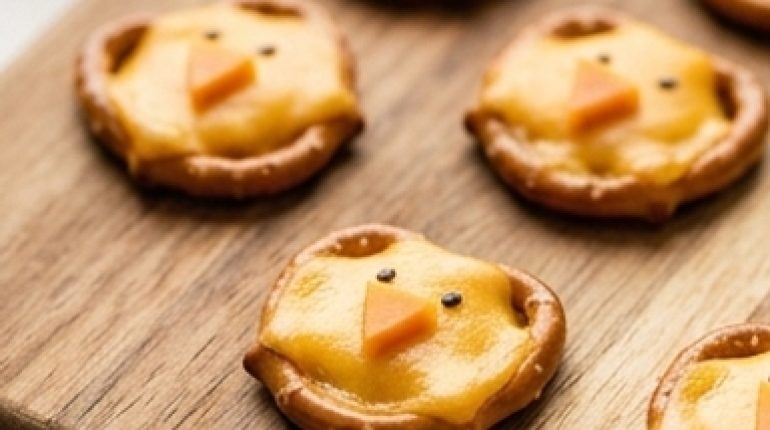- Pretzels — Take round pretzels, standard size — neither mini nor giant. The ring shape naturally creates the round silhouette of a chick’s body. Lorenz or Intersnack work well, but any store-bought pretzel does the trick as long as it is firm and very dry, not soft.