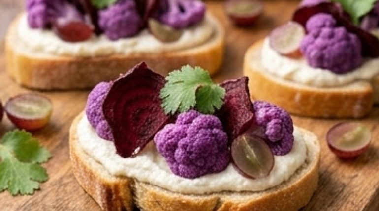 📌 Purple Cauliflower Bruschettas, Beet Chips, and Parmesan Cream
