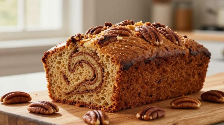 Southern American Recipe: This pecan bread combines coffee cake, cinnamon rolls, and Southern tradition in less than 15 minutes. Originally from Alabama, this soft bread combines toasted pecans, cinnamon, and brown sugar in a simple-to-prepare recipe. Imagine a golden, tender bread scented with vanilla and nutmeg, enhanced by a sweet glaze.