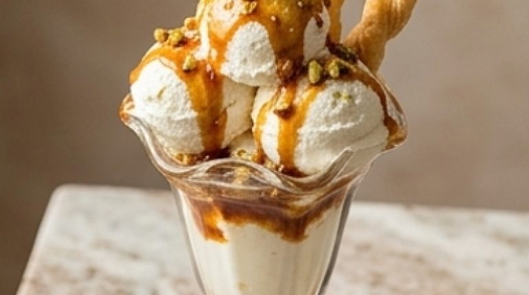 📌 Trompe-l’œil Sundae: Whipped Feta, Hot Honey Caramel, and Puff Pastry Twists